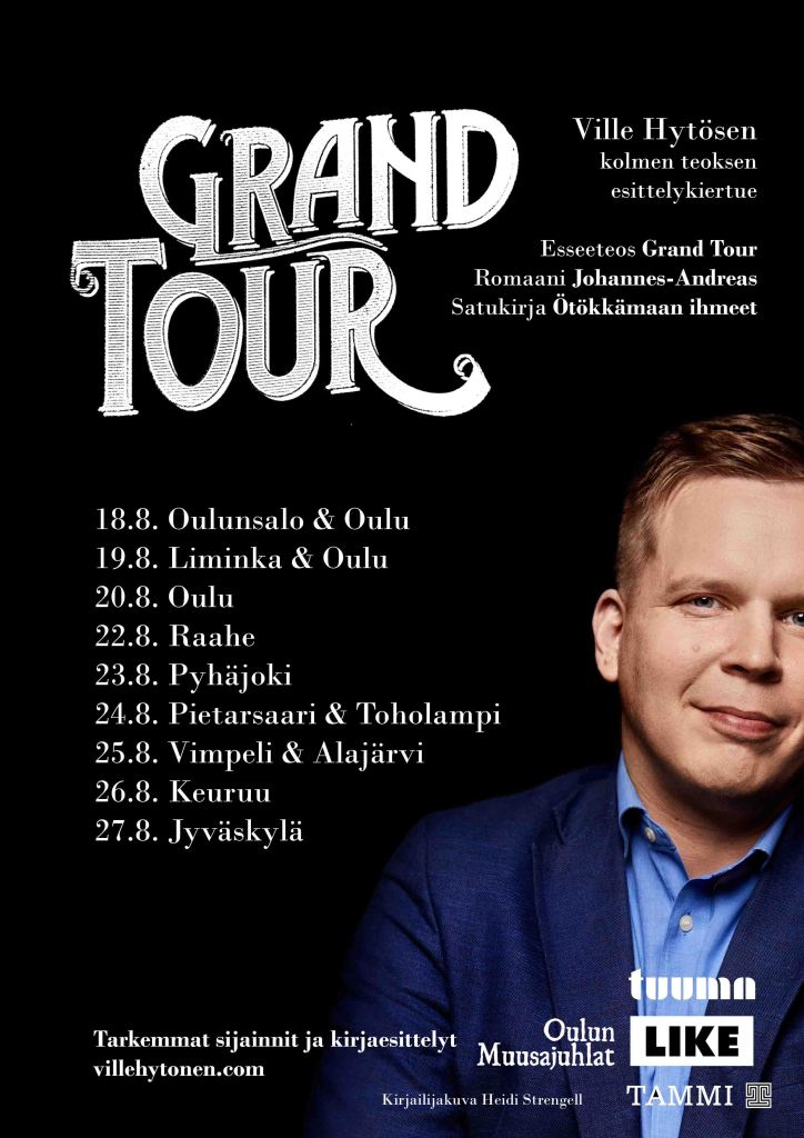 eli Pohjanmaan ja Keski-Suomen kiertue syksyllä 2022 käynnistyy Oulusta. Kiertueella juhlistetaan syksyllä julkaistavaa esseeteosta Grand Tour (jonka muuten saa täältä huomattavalla erityishinnalla 22€ täältä. Normaalisti 32€), uutta lastenkirjaa Ötökkämaan ihmeet sekä keväällä julkaistua romaania Johannes-Andreas.